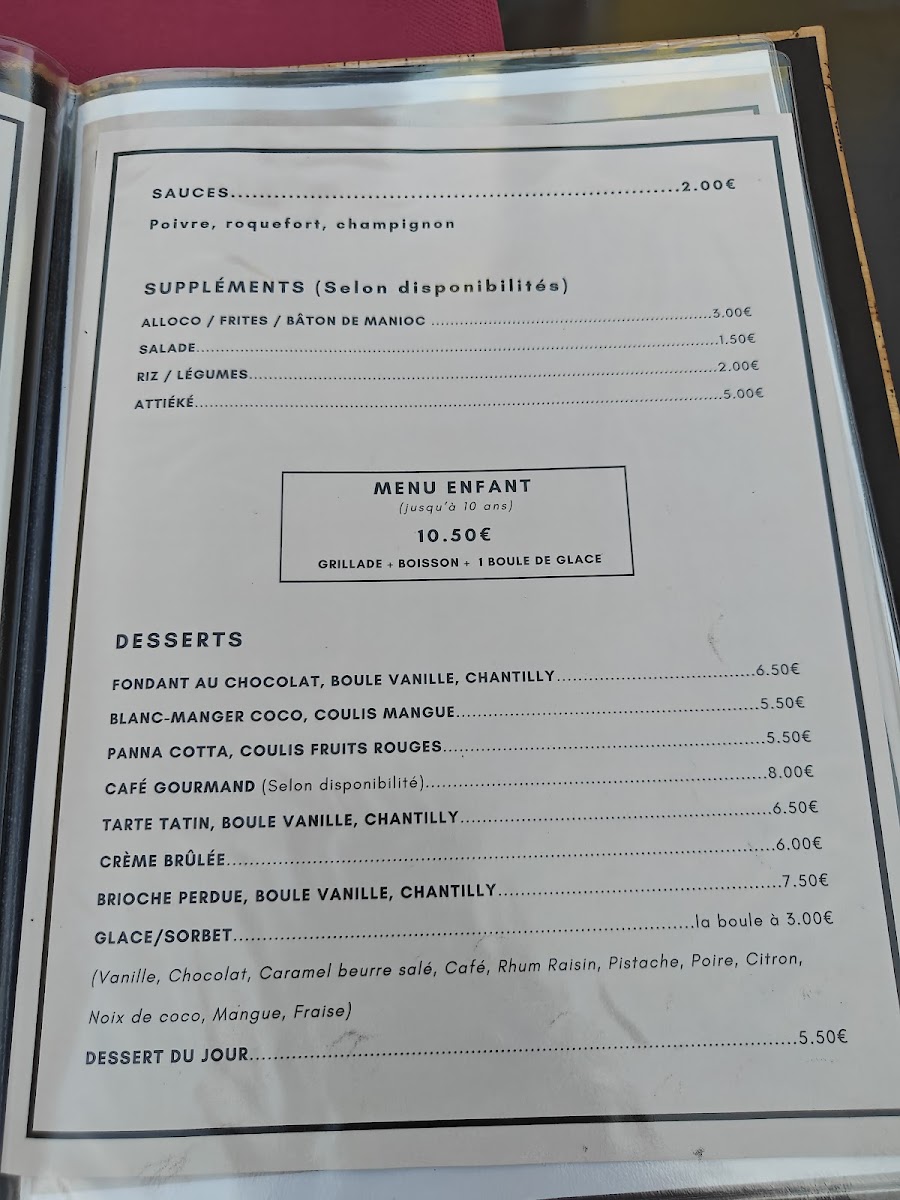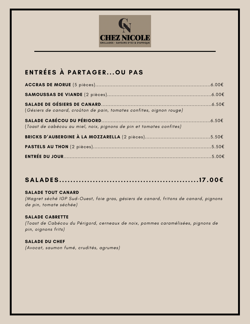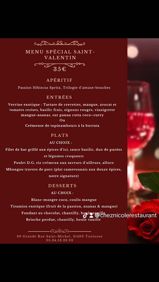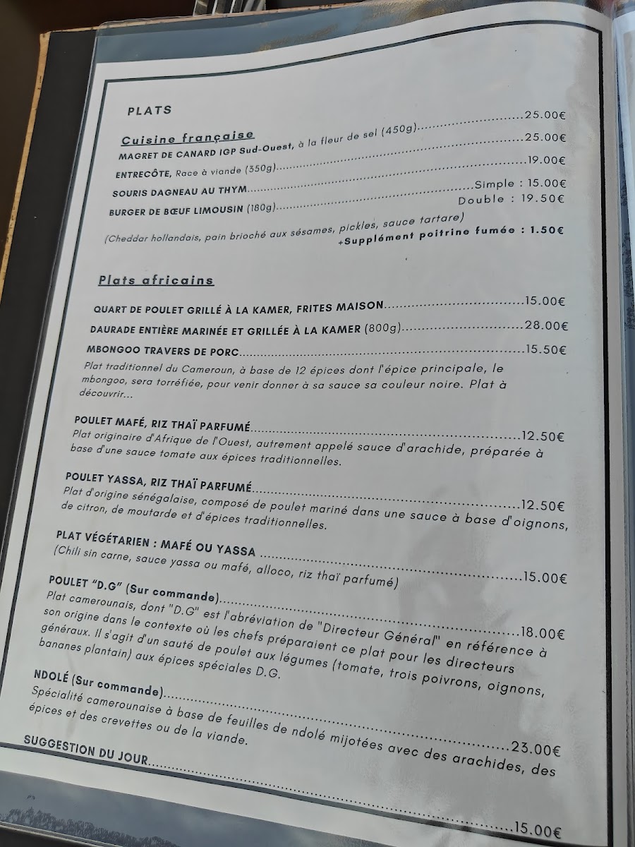 The menu at Restaurant Chez Nicole in Toulouse offers a delightful fusion of French and African flavors, with a wide selection of dishes to suit various tastes. For starters, you can indulge in flavorful Accras de Morue, Samosas de Viande, or a refreshing Salade de Gésiers de Canard, with options like Salade Cabécou du Périgord and Bricks d'Aubergine à la Mozzarella. The salads are a highlight, with choices such as Salade Tout Canard, Salade Cabrette, and the signature Salade du Chef. Moving to the heart of the menu, the French cuisine section features tender cuts like Magret de Canard IGP Sud-Ouest (450g), Entrecôte (350g), and Souris d'Agneau au Thym. For those seeking something different, the African-inspired dishes offer an exciting range, including Quart de Poulet Grillé à la Kamer, Dauraude Entière Marinée et Grillée à la Kamer (800g), and the comforting Poulet Yassa with aromatic Thai rice. The restaurant also offers a variety of sauces such as Poivre, Roquefort, and Champignon, along with sides like Frites Maison and Riz Thaï Parfumé. To finish your meal, treat yourself to one of the delicious desserts, including the indulgent Fondant au Chocolat, Panna Cotta with Coulis Fruits Rouges, or the tropical Blanc-Manger Coco with Coulis Mangue. For a lighter option, try one of the house-made Coupes Glacées like Café Liégeois or Dame Blanche. The unique alcoholic Coupes Glacées, such as Coupe Colonel and Maréchal, are perfect for those looking for a little extra indulgence.