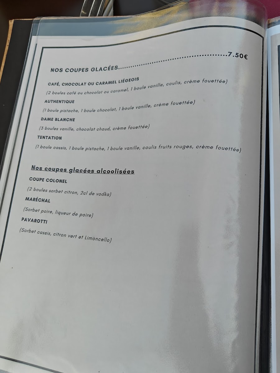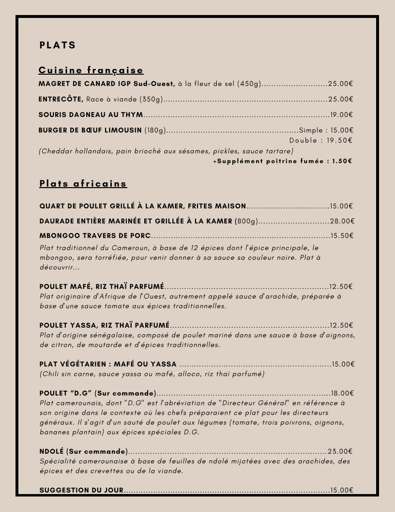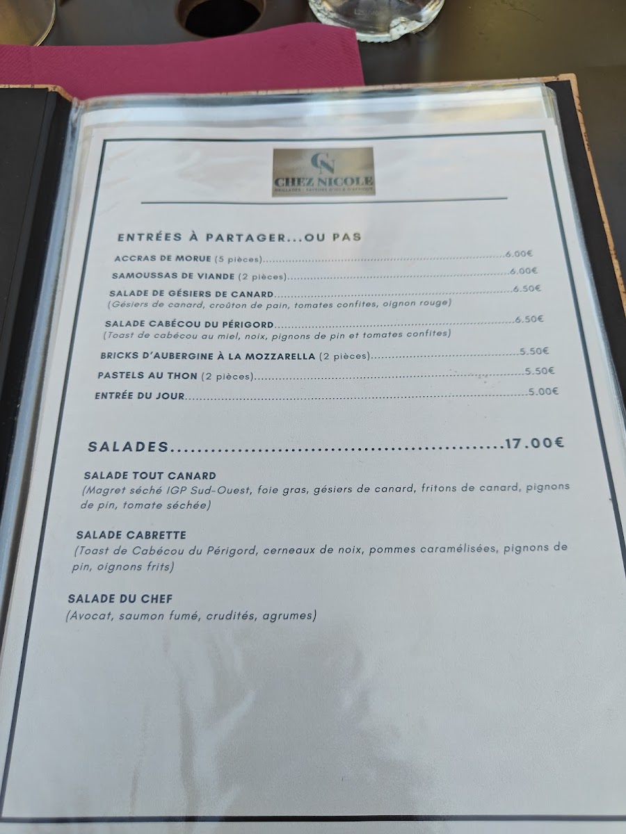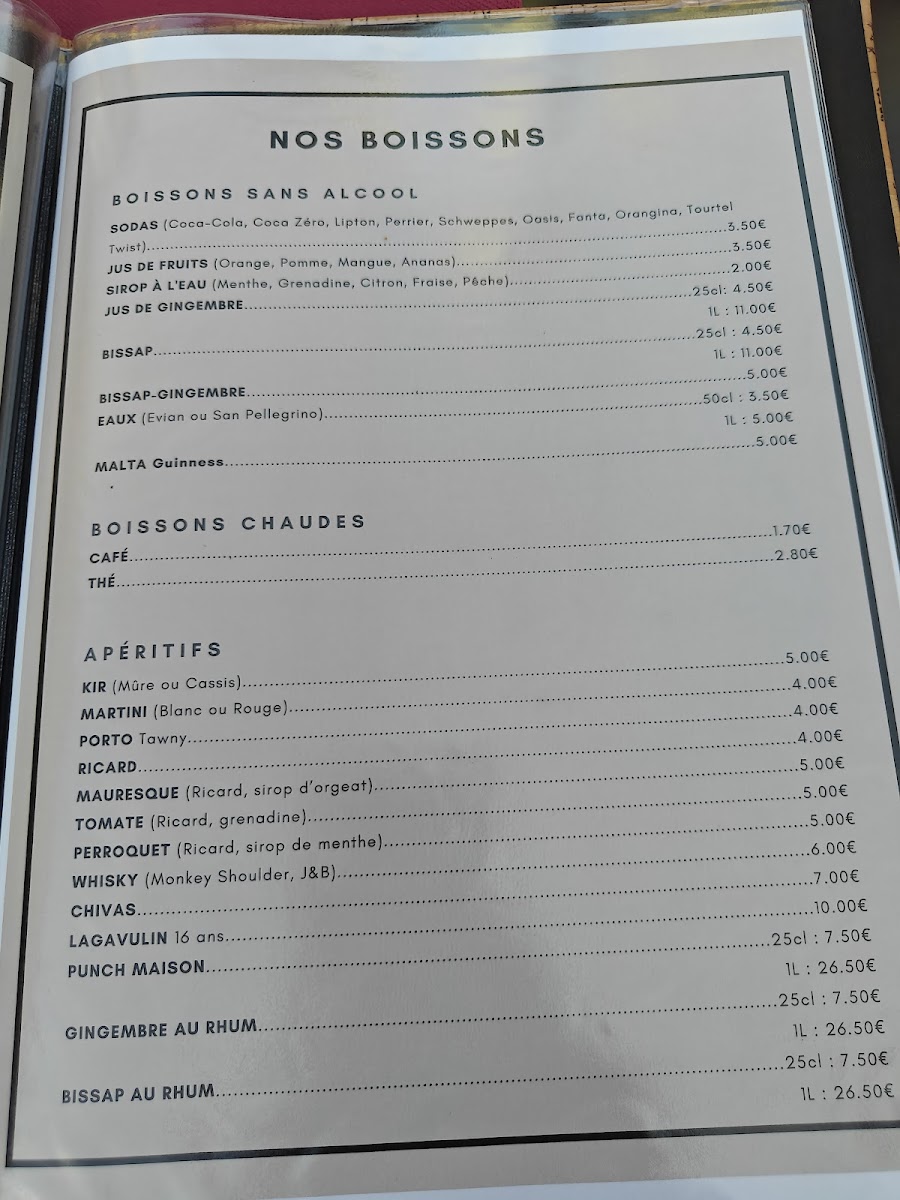 The menu at Restaurant Chez Nicole in Toulouse offers a delightful fusion of French and African flavors, with a wide selection of dishes to suit various tastes. For starters, you can indulge in flavorful Accras de Morue, Samosas de Viande, or a refreshing Salade de Gésiers de Canard, with options like Salade Cabécou du Périgord and Bricks d'Aubergine à la Mozzarella. The salads are a highlight, with choices such as Salade Tout Canard, Salade Cabrette, and the signature Salade du Chef. Moving to the heart of the menu, the French cuisine section features tender cuts like Magret de Canard IGP Sud-Ouest (450g), Entrecôte (350g), and Souris d'Agneau au Thym. For those seeking something different, the African-inspired dishes offer an exciting range, including Quart de Poulet Grillé à la Kamer, Dauraude Entière Marinée et Grillée à la Kamer (800g), and the comforting Poulet Yassa with aromatic Thai rice. The restaurant also offers a variety of sauces such as Poivre, Roquefort, and Champignon, along with sides like Frites Maison and Riz Thaï Parfumé. To finish your meal, treat yourself to one of the delicious desserts, including the indulgent Fondant au Chocolat, Panna Cotta with Coulis Fruits Rouges, or the tropical Blanc-Manger Coco with Coulis Mangue. For a lighter option, try one of the house-made Coupes Glacées like Café Liégeois or Dame Blanche. The unique alcoholic Coupes Glacées, such as Coupe Colonel and Maréchal, are perfect for those looking for a little extra indulgence.