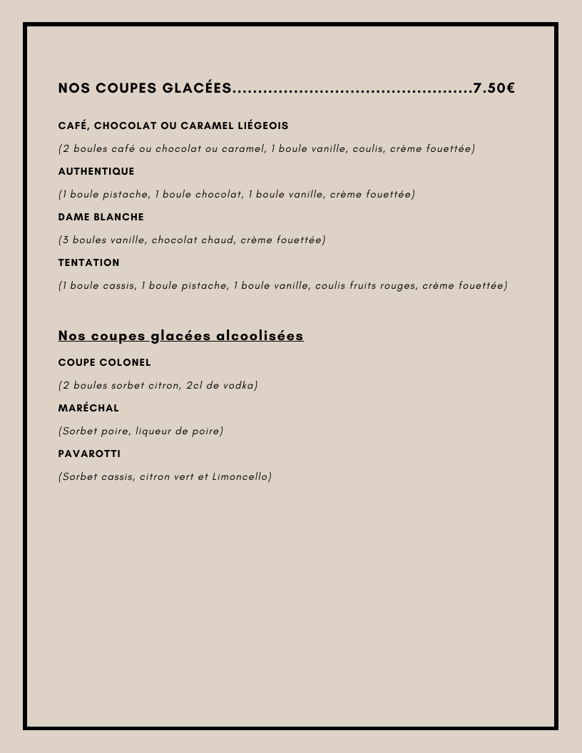 (2 boules café ou chocolat ou caramel, 1 boule vanille, coulis, crème fouettée)